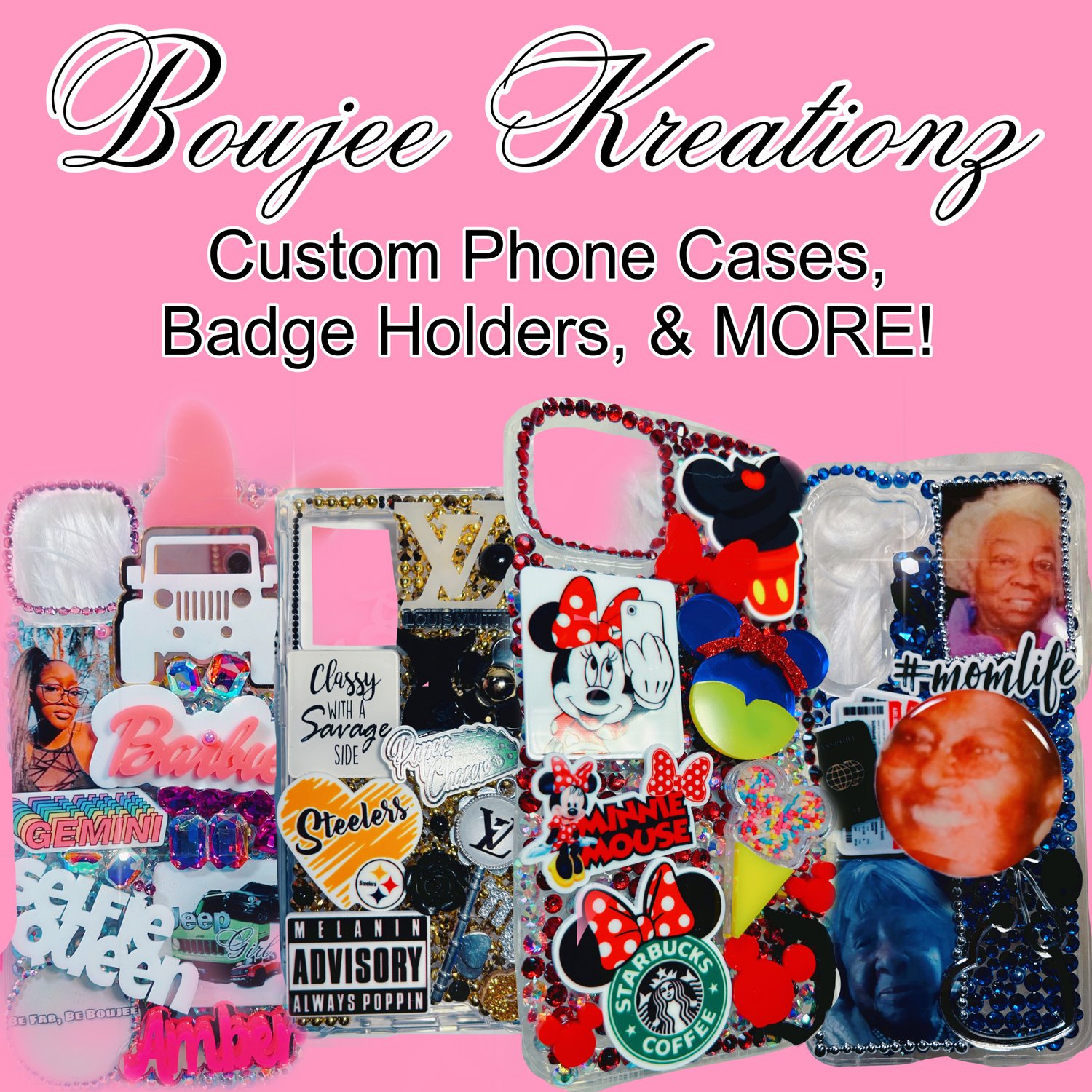 All case orders come with a new phone case of your choice. Clear hard bumper cases or clear hard snap on cases is used to craft on. Color coordinating bling included! Check out my Facebook page for available sets. Please allow 1 week for regular custom case orders to be customized & shipped.